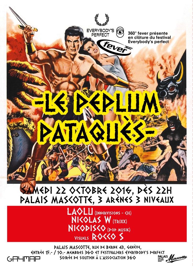 Soirée de clôture du festival Everybody’s Perfect. Trois arènes, trois niveaux, avec DJs Laolu (Innervisions), Nicolas W (Trixx), Nicodisco (pop musik), visuels par Rocco S.