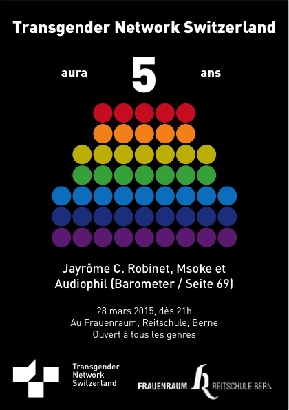 5 ans de Transgender Network Switzerland 28 mars 2015 par Chatty Chargement de la carte… Frauenraum Reitschule BernNeubrückstr. 8 - BerneDetails 46.9529304 7.4403776000000335 Date Date(s) - 28.03.201521h00 Lieu Frauenraum Reitschule Bern Catégorie(s) Pas de Catégories