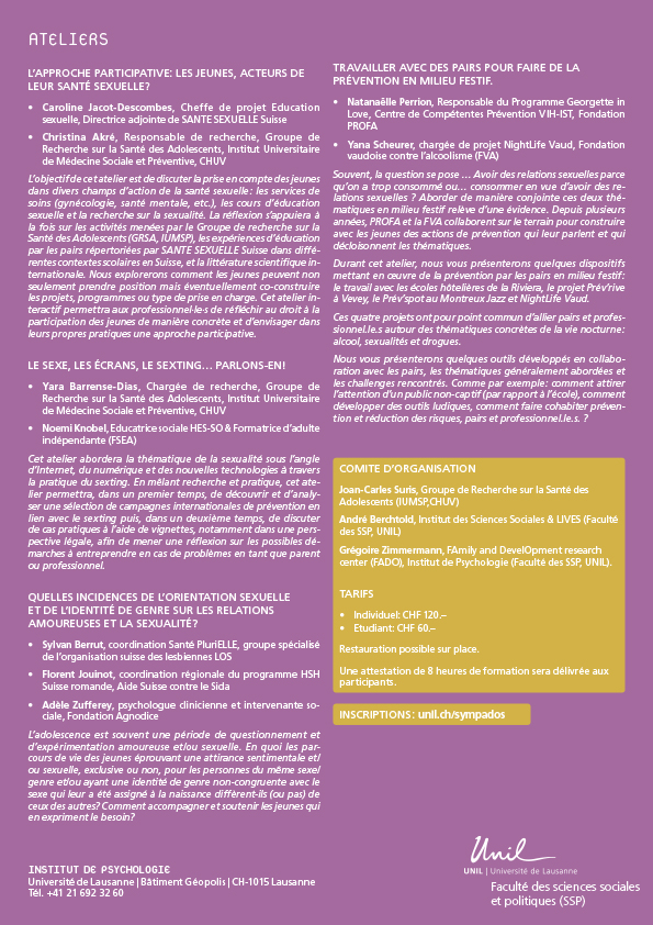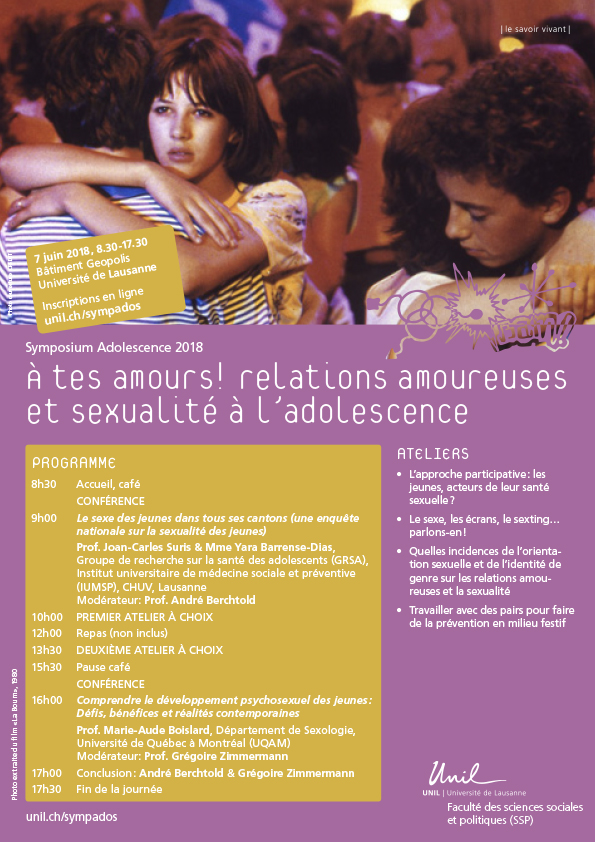 Jeudi 7 juin, l’Université de Lausanne accueillera un symposium interdisciplinaire sur l’adolescence qui comprendra deux conférences et des ateliers, dont un intitulé « Quelles incidences de l’orientation sexuelle et de l’identité de genre sur les relations amoureuses et la sexualité? » auquel nous participerons.