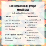 Le groupe de soutien "Mosaïk 360" est un groupe qui accueille les personnes lesbiennes, gays, bi, trans*, intersexes, queer et plus : à mobilité réduiteneuroatypiques/neurodivergentesavec une déficience intellectuelleayant un handicap sensoriel Pourquoi faire ce groupe ? Pour rencontrer des personnes avec qui : DiscuterFaire des activités Pour pouvoir parler … [Lire plus...] à proposLe groupe Mosaïk 360 fait sa rentrée à la Maison de Quartier des Pâquis
