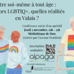 Dans le cadre d'un projet soutenu par la coordination cantonale 60+, l'association Alpagai organise une conférence le jeudi 2 novembre à l'intention du personnel des domaines des soins et du social : Seniors LGBTIQ+, quelles réalités en Valais ? Le projet seniors LGBT de l'Association 360 y interviendra pour présenter le projet genevois. Plus d'infos ici : … [Lire plus...] à proposConférence du Projet seniors LGBT en Valais