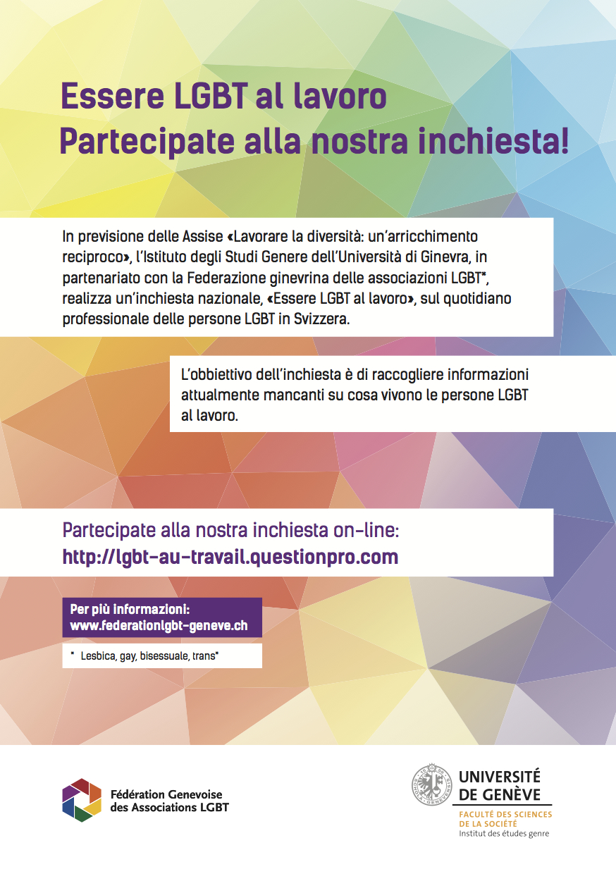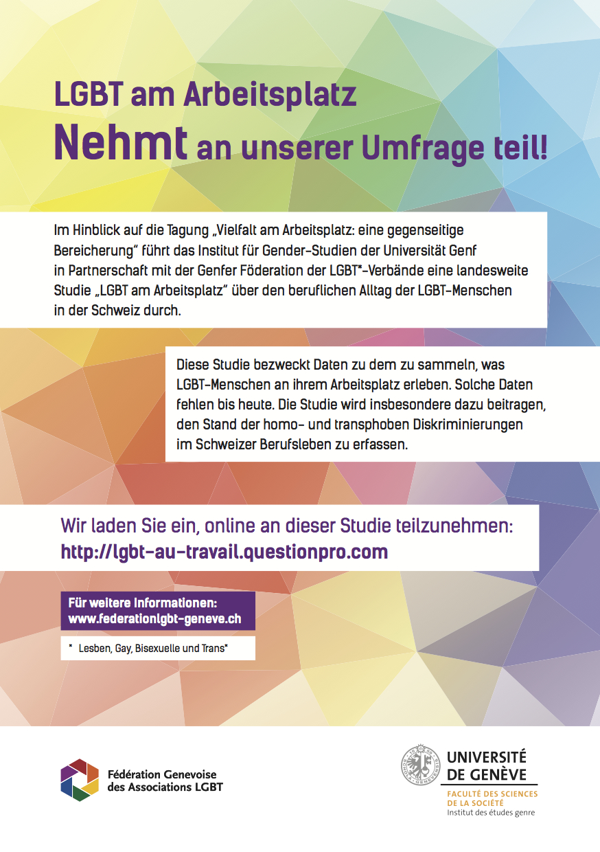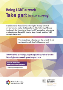 Nous avons le plaisir de vous annoncer que l’enquête nationale « Etre LGBT au travail », menée conjointement par l’Institut des Etudes Genre de l’Université de Genève et la Fédération genevoise des associations LGBT et portant sur le quotidien professionnel des personnes LGBT en Suisse, est maintenant disponible en allemand, en italien et en anglais !