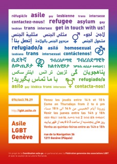 Ce projet se déroulera de janvier 2016 à décembre 2017. N’hésitez pas à en parler aux personnes concernées, qui peuvent nous joindre: - à notre permanence: les jeudis de 14h à 18h, dans les locaux de l’association 360, 36 rue de la Navigation aux Pâquis - par téléphone: 076/663 78 29 - sur notre site: http://lgbt.asile.ch