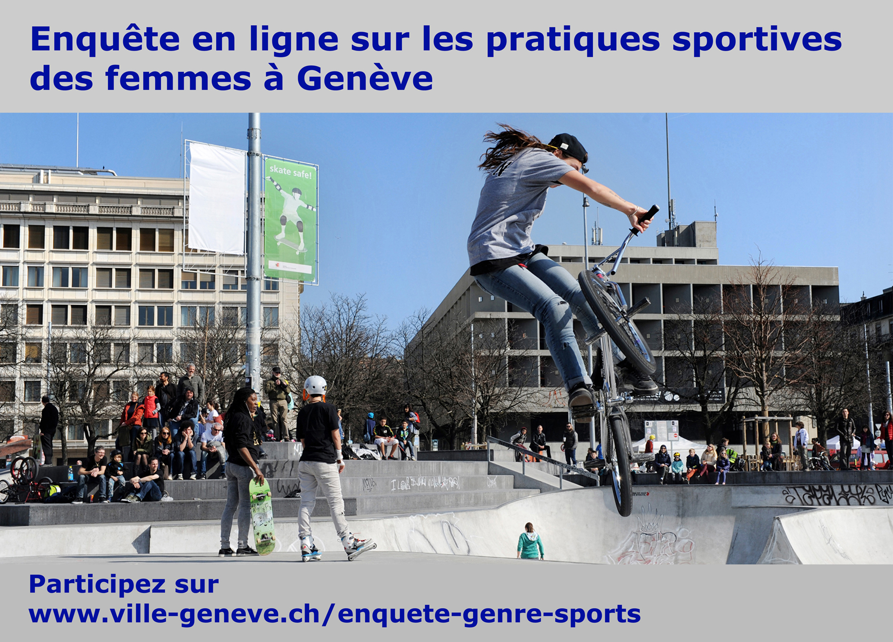Dans le prolongement de son Programme « Genre et sports », la Ville de Genève lance une enquête pour mieux comprendre les enjeux du sport féminin à Genève. Jusqu’au 31 octobre 2016, les femmes, qu’elles soient un peu, beaucoup ou pas du tout sportives, sont invitées à répondre à un questionnaire en ligne, pour permettre de mieux comprendre les facteurs qui influencent leurs pratiques sportives, et ainsi orienter au mieux l’offre sportive. Ce questionnaire est destiné à toutes les femmes de la région genevoise, quel que soit leur âge ou encore leur origine. Il peut être complété en ligne à l’adresse www.ville-geneve.ch/enquete-genre-sports