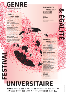 Les 2, 3 et 4 avril 2017, l’Association des Etudiant-e-s en Etudes Genre de l’Université de Genève organise le FUGE, Festival universitaire Genre et Egalité à l’Université de Genève.