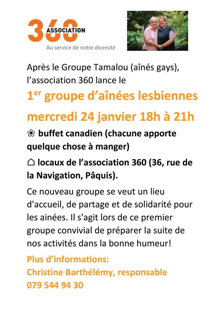 Après le groupe Tamalou (aînés gay), l’association 360 lance son nouveau groupe d’aînées lesbiennes. L’association vous donne rendez-vous mercredi 24 janvier à 18h. Toutes les informations sur le flyer ci-desous.