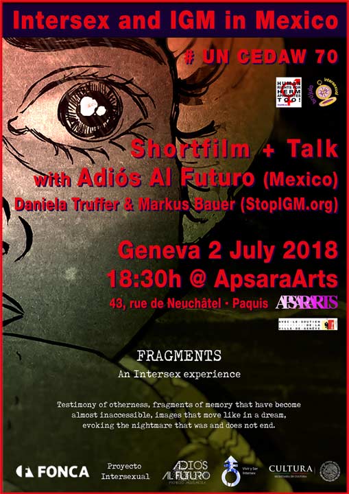 L’artiste visuelle mexicaine intersexe Adiós al Futuro (Proyecto Intersexual) sera à Genève pour témoigner devant le Comité et présentera et discutera son court métrage « Fragments. An Intersex experience »(Mexique 2018, 10:21 minutes, espagnol, avec sous-titres en anglais), un regard sans faille sur MGI au Mexique, en partie basé sur les témoignages des ONG mexicaines Brújula Intersexual et Vivir y Ser Intersex, co-rapporteurs au CEDAW.