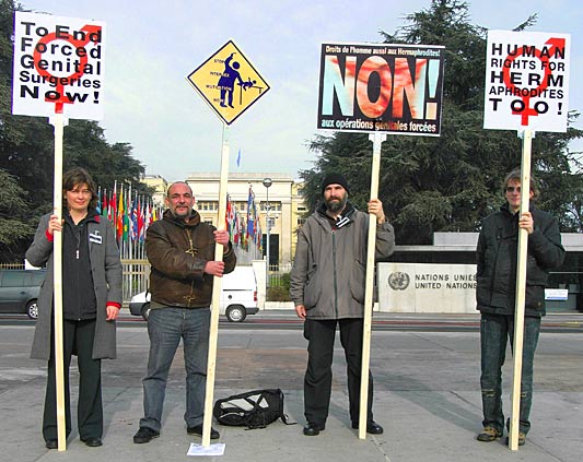 StopIGM.org exige l’interdiction des chirurgies génitales forcées sur les enfants et les adolescents avec une variation de l’anatomie reproductive et « Les droits humains pour les hermaphrodites aussi! »