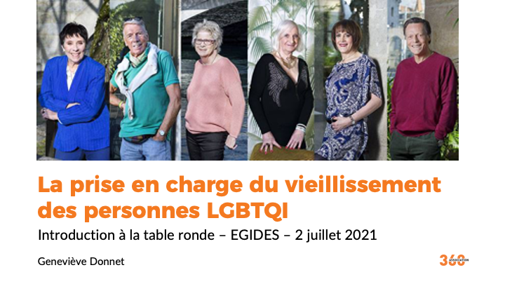 Table ronde « La prise en charge du vieillissement des personnes LGBTQI » 2 juillet 2021 par Geneviève dans le cadre de la conférence internationale d’EGIDES « Vivre l’égalité et les diversités dans la francophonie : culture, santé, sécurité », le 2 juillet 2021 à Genève et en ligne. Télécharger les slides de la présentation