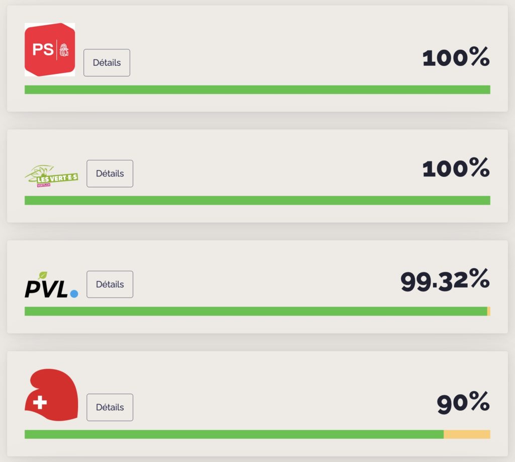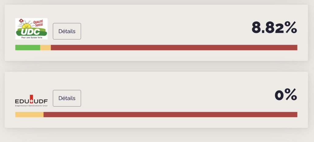 En tête : les Vert-es et le PS, suivi-es des Vert’libéraux et du Parti du Travail, classé-es respectivement 100%, 100%, 99,32% et 90% LGBTIQ-friendly. Viennent ensuite le PLR avec 58,48%, le Centre avec 40,41% et le PEV avec 23,33%. Tout au fond de la liste, sans grande surprise, figurent l’UDC avec 8,82%, et l’UDF avec 0% de vote LGBTIQ-friendly.