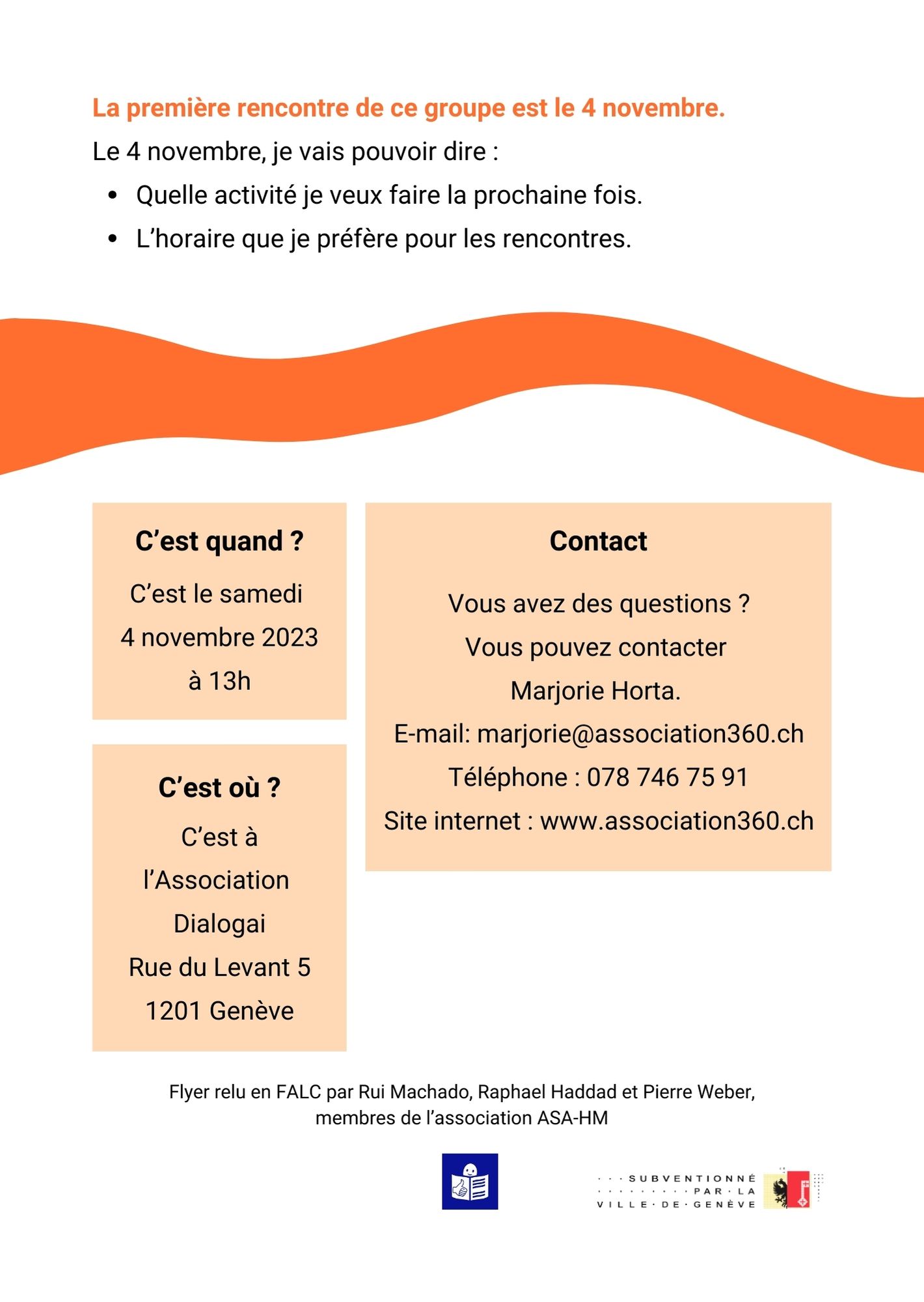 Pour toute information supplémentaire, veuillez contacter Marjorie Horta à l’adresse marjorie@association360.ch ou au 078/746.75.91.