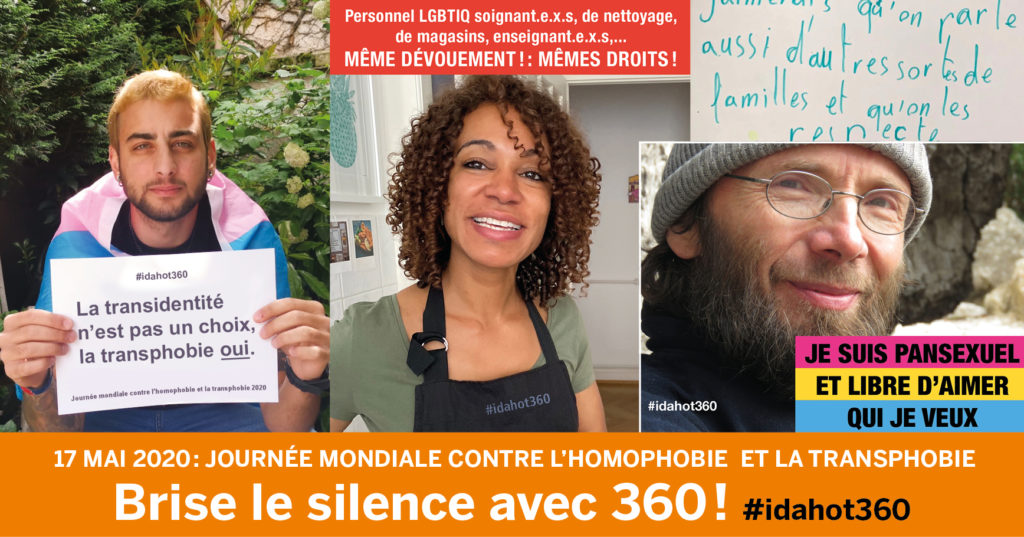 La crise du coronavirus n’empêche pas l’action et la visibilisation ! En vue de la journée mondiale contre l’homophobie, la biphobie et la transphobie, le 17 mai, 360 organise une flashmob virtuelle : invente un slogan revendicatif, prends-toi en photo un panneau à la main, et publie ton image sur la plateforme que tu préfères.
