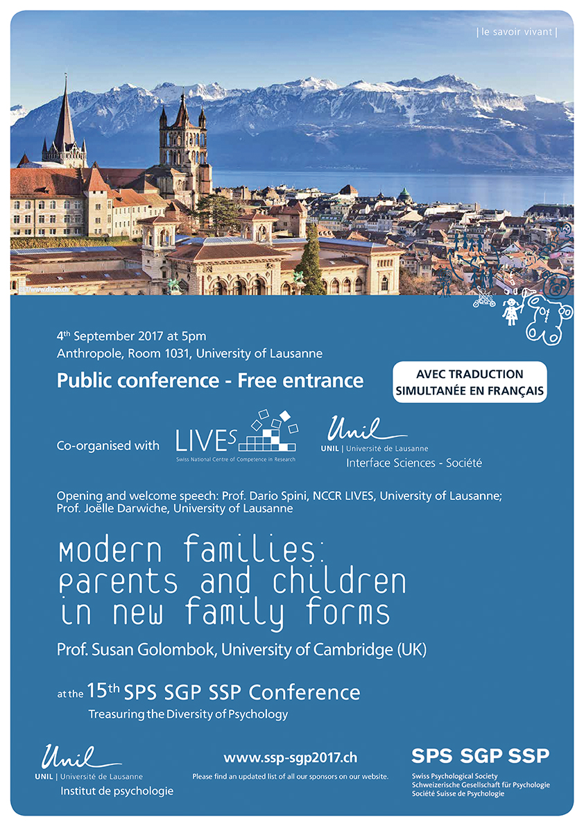 Conférence publique de la Prof. Susan Golombok de l’Université de Cambridge en Angleterre aura lieu à l’Université de Lausanne, bâtiment Anthropole, salle 1031, le lundi 4 septembre 2017 de 17h00 à 18h15 sur le thème des nouvelles familles.