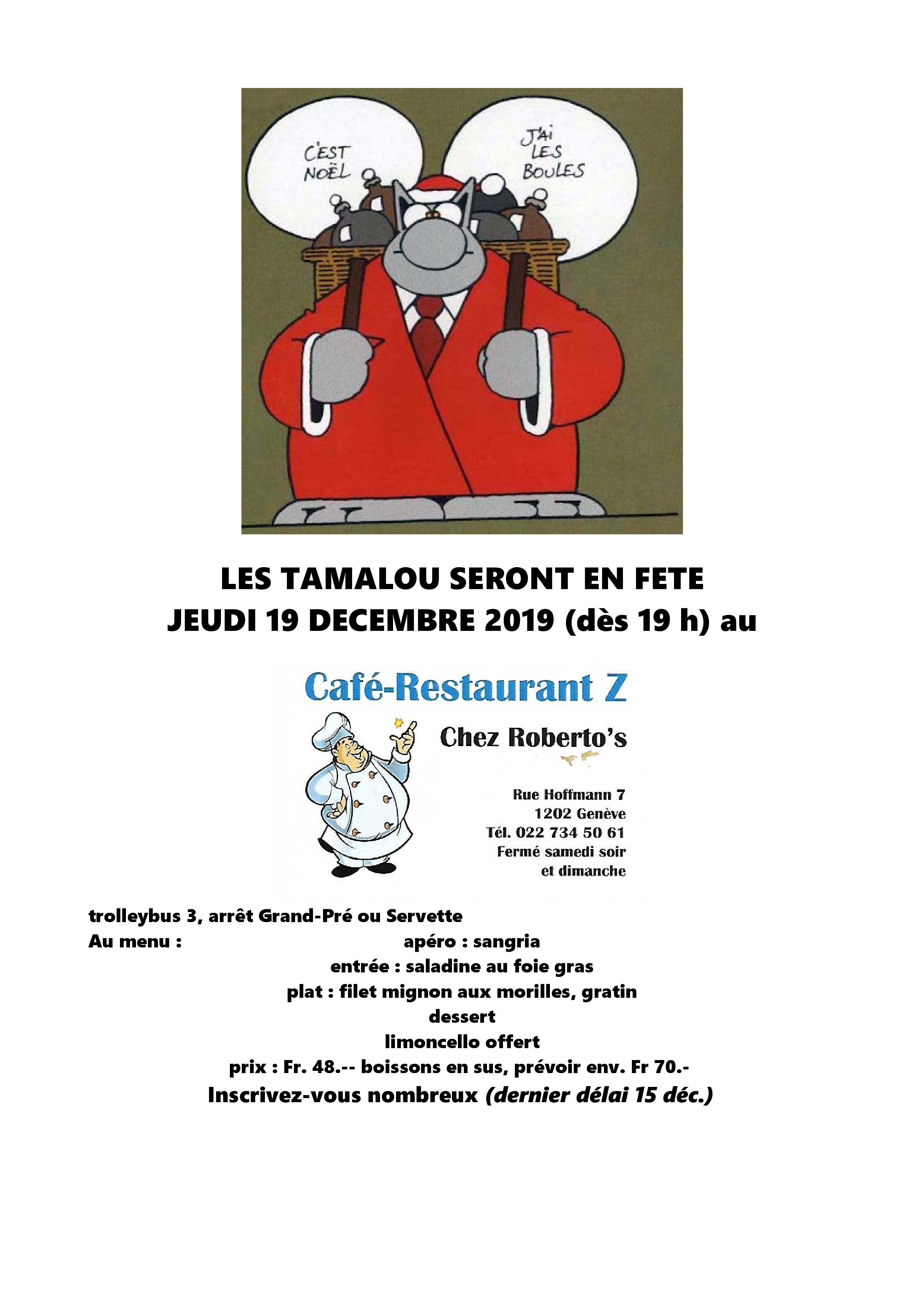 Les Tamalou en fête 19 décembre 2019 by Chatty Inscrivez-vous au plus tard le 15 décembre par mail andr.lauper@yahoo.com. Consulter aussi la page facebook du groupe Tamalou Carte non disponible Date Date(s) - 19.12.201919h00 Lieu Catégorie(s) Pas de Catégories