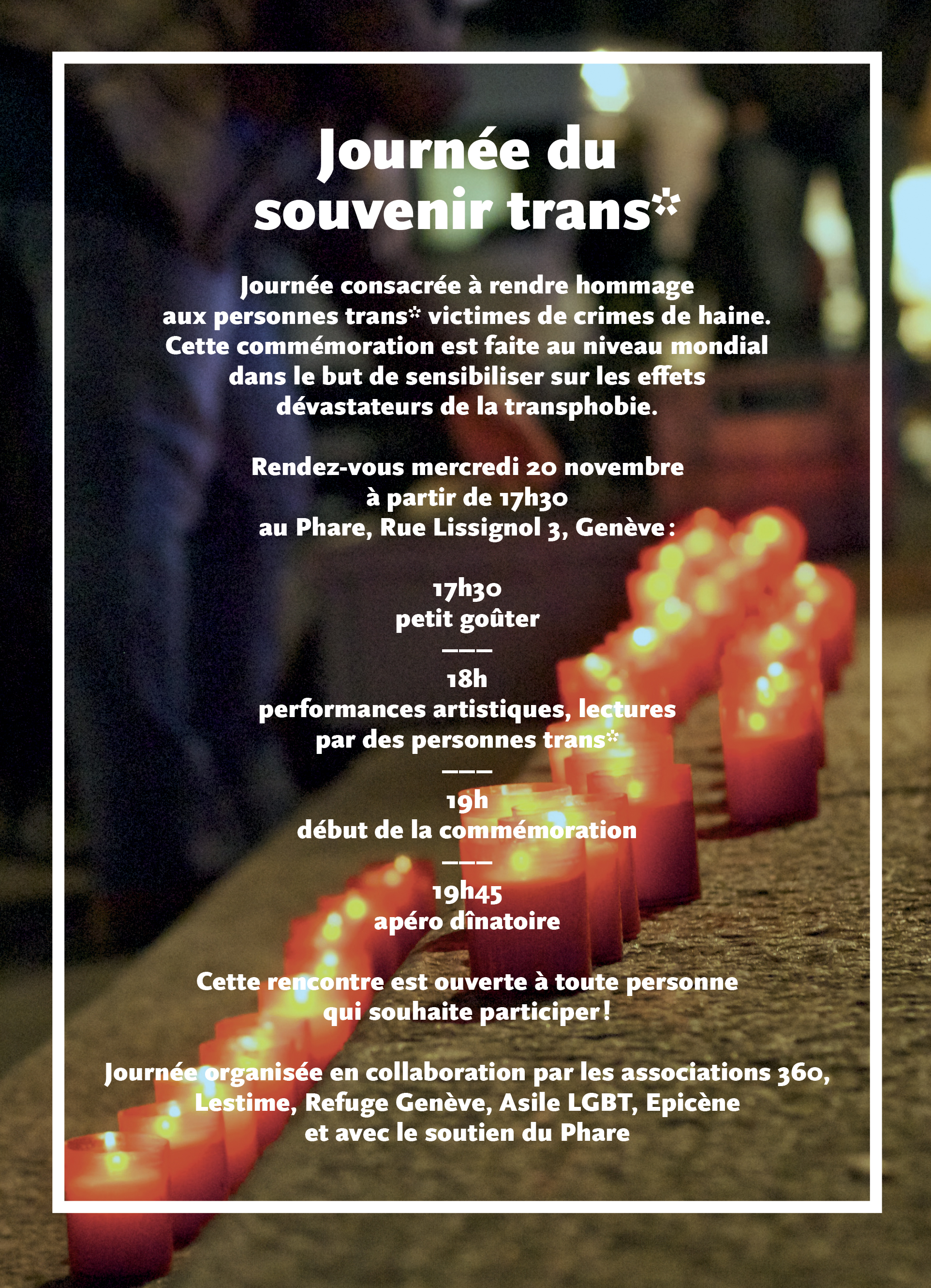 Journée de souvenir trans* 20 novembre 2019 by Cris Quand 20.11.2019 18h30 - 22h00 Add To Calendar Download ICS Google Calendar iCalendar Office 365 Outlook Live Auparavant, le CRAQ (Collectif radical d’action queer) organise un rassemblement contre les violences trans*phobes devant l’Hôtel de ville de Genève, à partir de 15h30.